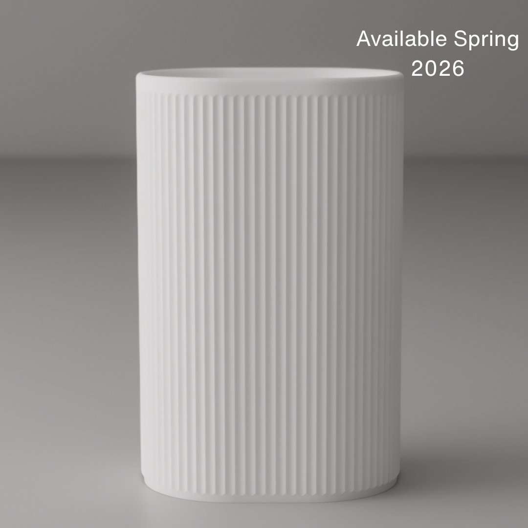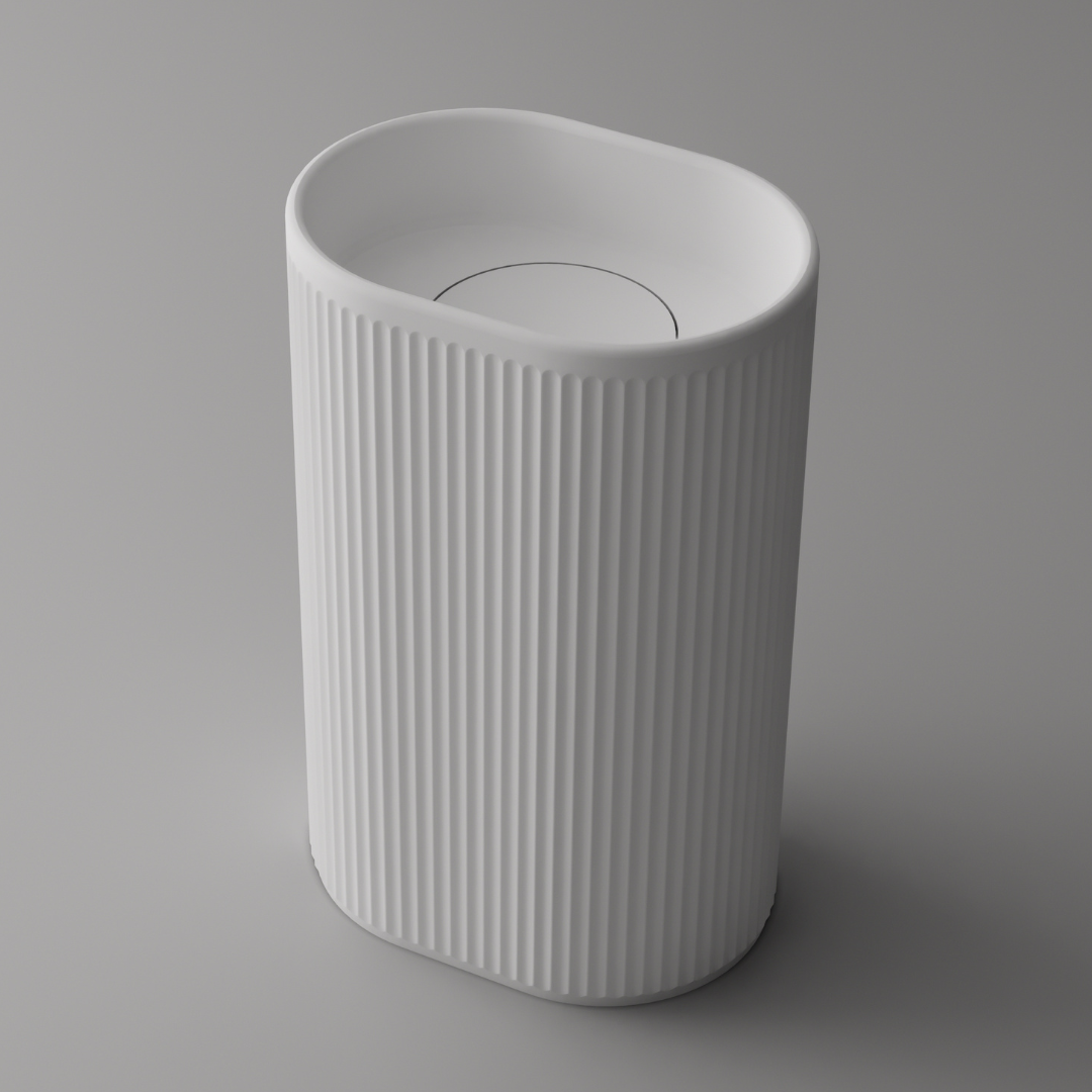 With its softly contoured oval form and continuous vertical fluting, this pedestal basin introduces a refined architectural rhythm to the bathroom. Designed for compact spaces or as a statement piece in larger settings, its sculptural silhouette adds both texture and visual depth while maintaining a sense of understated elegance.